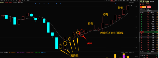 之所以会选择5连阳后介入,是因为如果K线结构连续5日阳线就证明有资金不断介入,既然资金选择连续小幅的拉升,后期股价则会有一定的上涨空间。