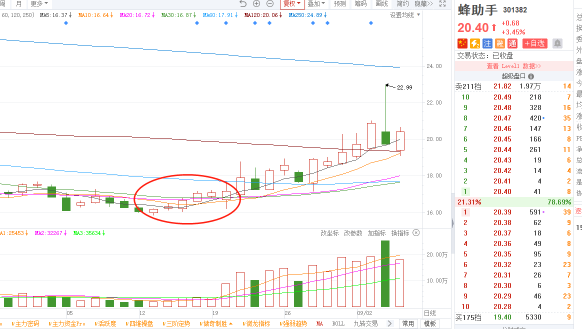 第二种走势,如下图蜂助手,出现连阳走势后持续上扬,维持5天线10天线,叠加华为概念、移动支付概念,整体走势强劲,符合连阳战法。