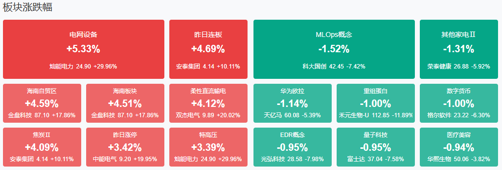 市场全天震荡反弹,三大指数低开高走,全线收红。沪深两市成交额1.87万亿,较上一个交易日缩量453亿。盘面上,市场热点轮番活跃,全市场近3400只个股上涨。从板块来看,电网设备板块持续爆发,京泉华3连板,摩恩电气、中能电气、神马电力2连板,特变电工等近20股涨停。海南板块再度走强,海马汽车等多股涨停。福建板块反复活跃,厦工股份2连板。泛消费概念股集体走强,凯撒旅业、安记食品等多股涨停。储能板块率先走强,通润装备涨停创趋势新高,阿特斯20cm涨停。下跌方面,量子科技概念股调整,科大国创、格尔软件走弱。