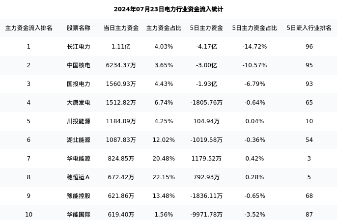 从主力资金流向来看,电力行业今日主力资金流入46.58亿,在所有申万二级行业中排名:115/131。