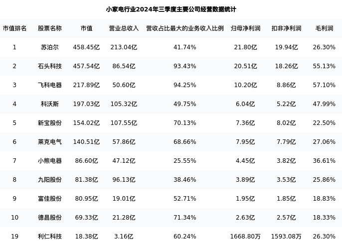 利仁科技最新报告期数据为三季度,下表汇总了小家电行业内市值靠前的公司三季度主要经营数据