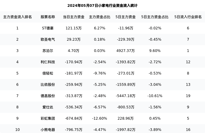 从主力资金流向来看,小家电行业今日主力资金流入7.29亿元,在所有申万二级行业中排名:74/131。