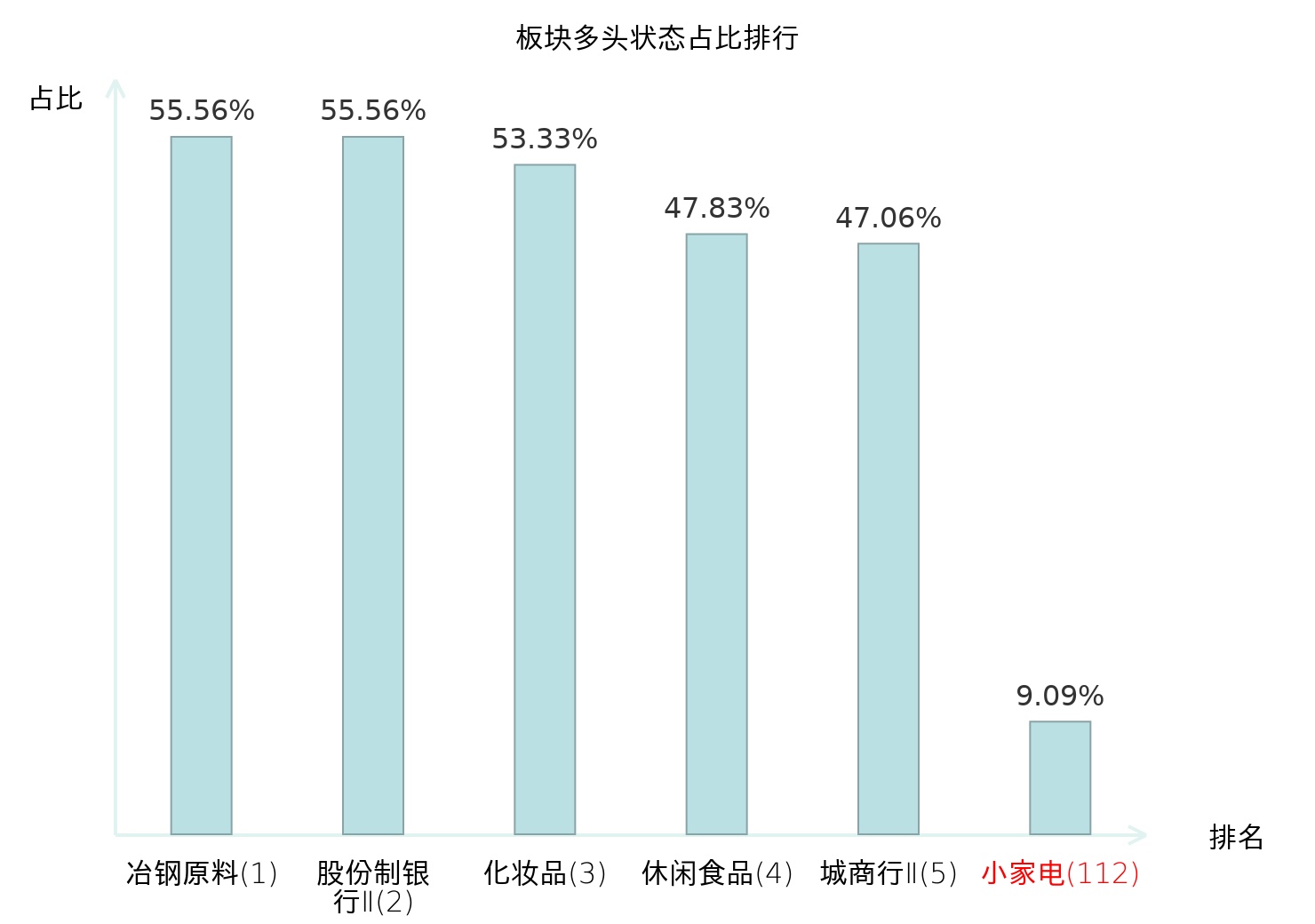 全市场所有行业板块中主力多头状态占比排名中,冶钢原料板块位居第一。其他家电Ⅱ板块名次提升最快,较昨日上升105位。