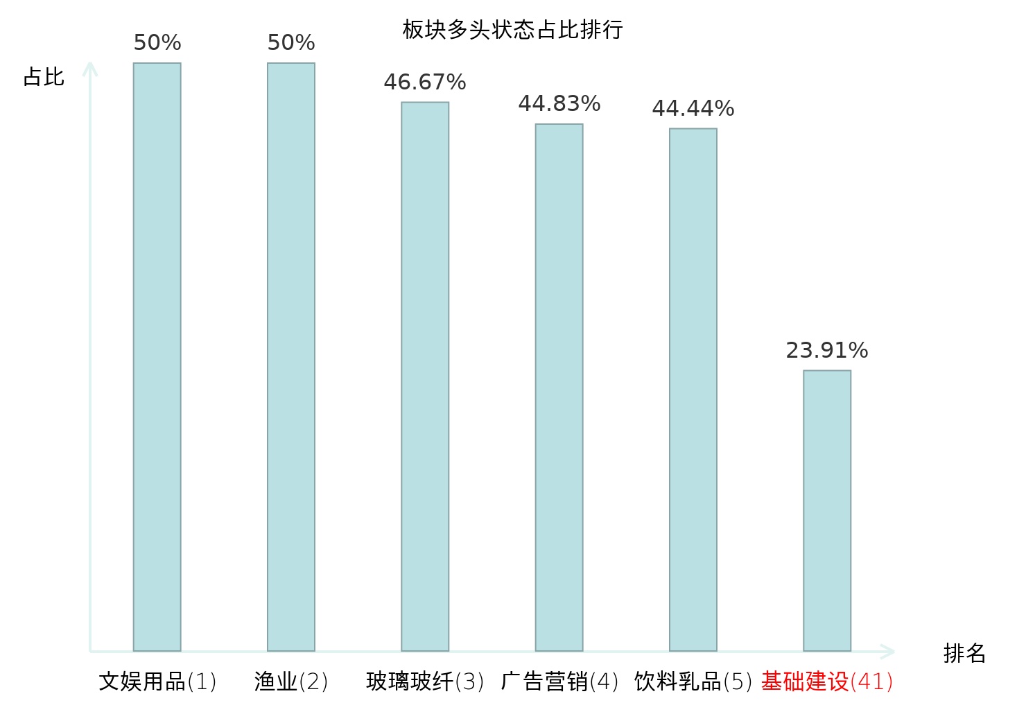 全市场所有行业板块中主力多头状态占比排名中,文娱用品板块位居第一。饮料乳品板块名次提升最快,较昨日上升59位。