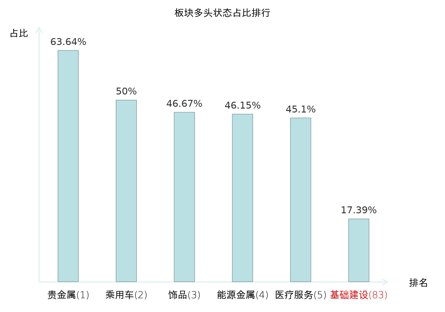 全市场所有行业板块中主力多头状态占比排名中,贵金属板块位居第一。电机Ⅱ板块名次提升最快,较昨日上升61位。