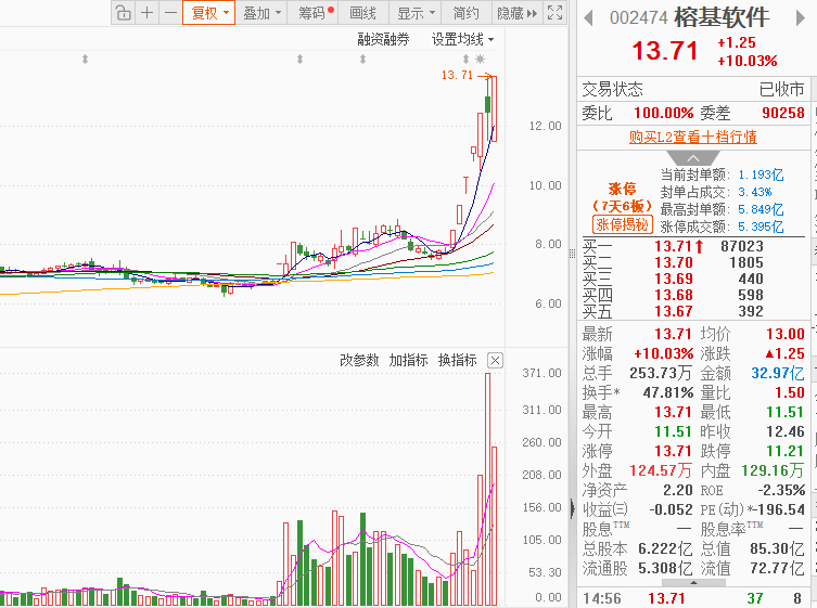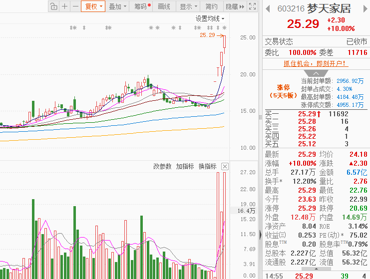 市场情绪:市场热点快速轮动,全市场4300只个股上涨,95只个股涨停。今日全市场共77股涨停,连板股总数12只,25股封板未遂,封板率为75%(不含ST股、退市股)。焦点股方面,市场连板高度降至5连板的梦天家居,固态电池概念股国晟科技走出12天8板,AI应用概念股榕基软件7天6板、实达集团4连板。