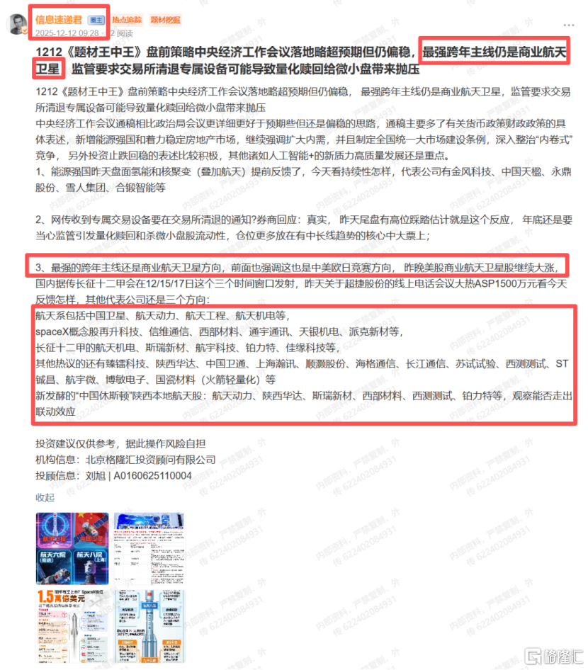 至于二级市场表现,大家除了关注火箭发射、产业进展和市场资金动向,后期还要重点跟踪相关标的的订单情况和业绩预告,把握波段机会。
