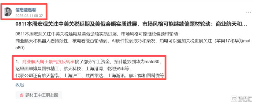 我们格隆汇会员圈子从8月初商业航天承接军工资金开始就已经提前捕捉到了相关核心标的先手布局机会,同时在11月24开启的主升浪行情也是第一时间给会员朋友持续把握住了大机会,相关个股区间涨幅大都翻倍了(本公众号也有持续推荐相关机会可以自行查阅):