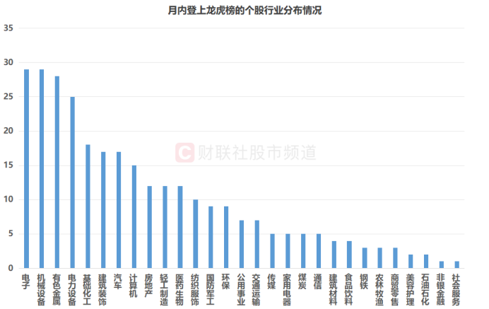 注:月内登上龙虎榜的个股行业分布情况(截至10月20日数据)