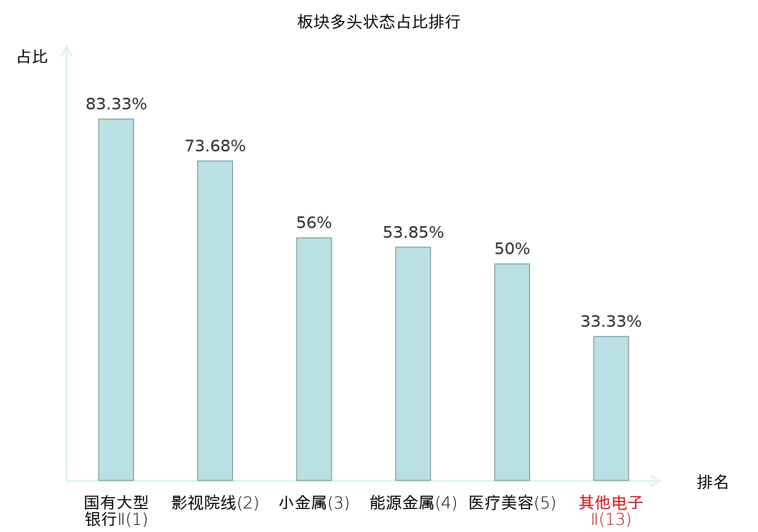 全市场所有行业板块中主力多头状态占比排名中,国有大型银行Ⅱ板块位居第一。电视广播Ⅱ板块名次提升最快,较昨日上升99位。