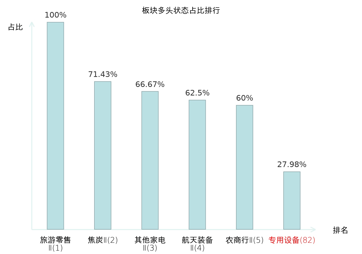 全市场所有行业板块中主力多头状态占比排名中,旅游零售Ⅱ板块位居第一。白酒Ⅱ板块名次提升最快,较昨日上升50位。