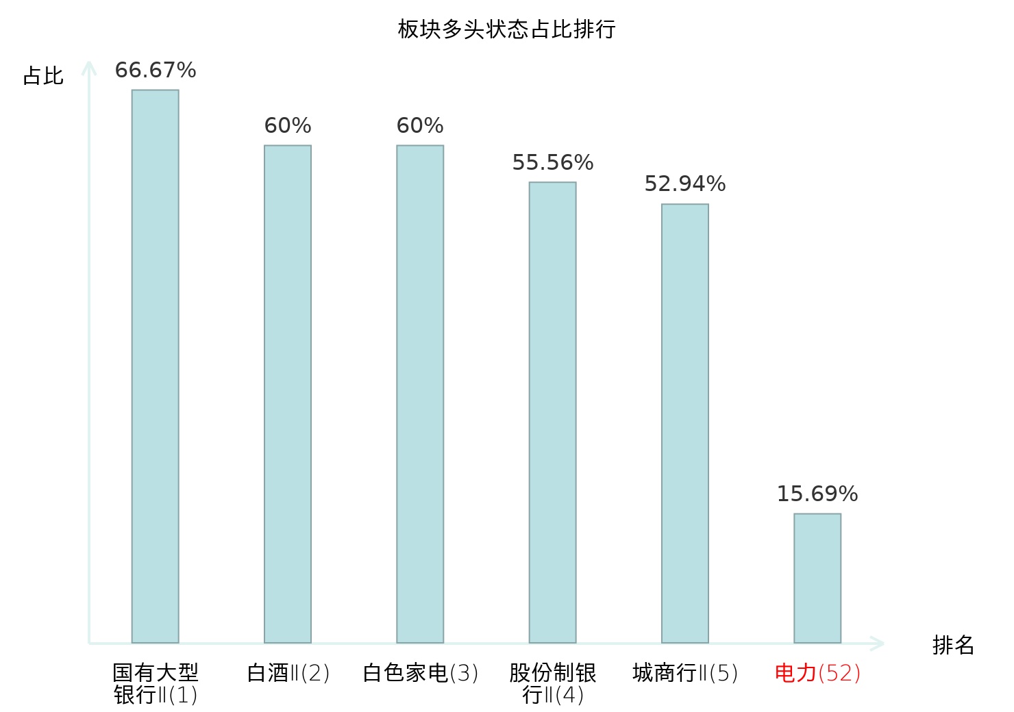 全市场所有行业板块中主力多头状态占比排名中,国有大型银行Ⅱ板块位居第一。医疗美容板块名次提升最快,较昨日上升110位。