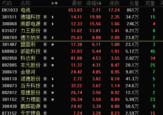 动力电池板块早盘也大幅拉升,德福科技20cm涨停,南都电源、信德新材涨超10%,科恒股份、盟固利、金银河、曼恩斯特、鹏辉能源等跟涨。