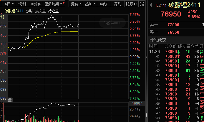 早盘,碳酸锂期货主力合约一度大涨超7%,午间收盘涨幅5.85%,报76950元/吨。现货方面,上海钢联发布数据显示,今日电池级碳酸锂价格较上日上涨1000元,均价报7.35万元/吨。