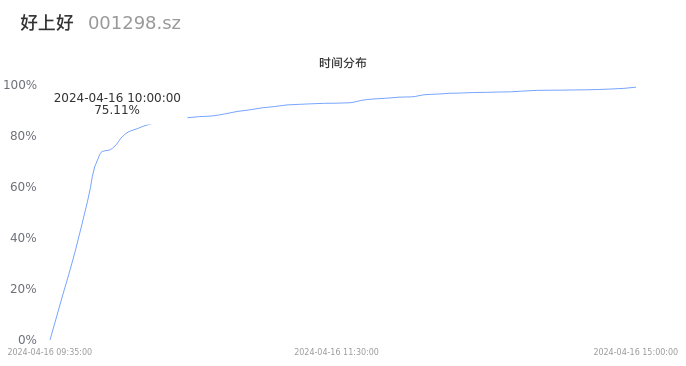 首先我们来看当日成交的时间分布。将今日交易时间按照5分钟的时间间隔进行切片,并绘制分布直方图进行观察。可以发现,10点之前的成交量占全天成交量的75.11%,这说明,该股票活跃时段换手火爆,资金热情高涨。