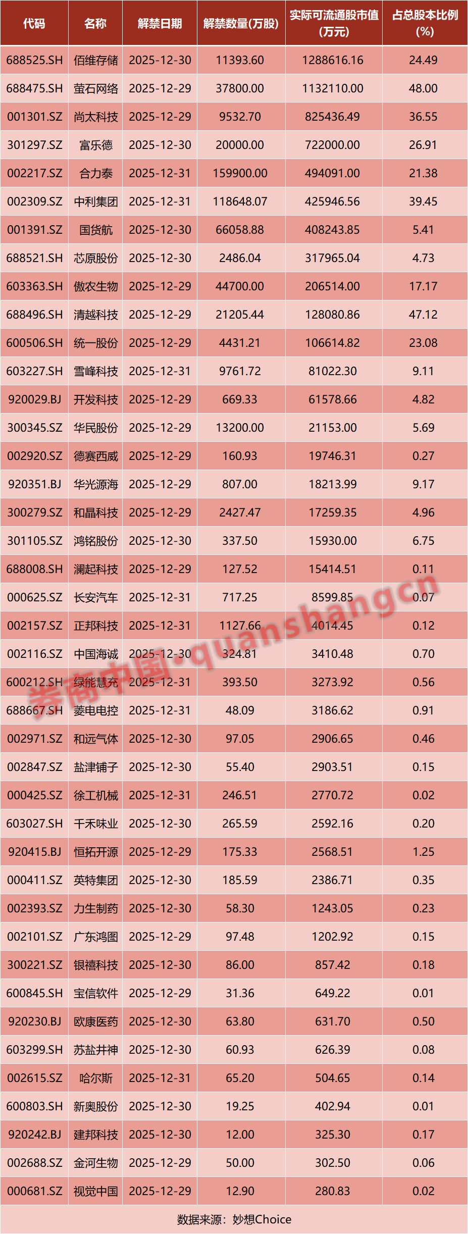从解禁占比来看,解禁占比居前三位的是:萤石网络(48%)、清越科技(47.12%)、中利集团(39.45%)。