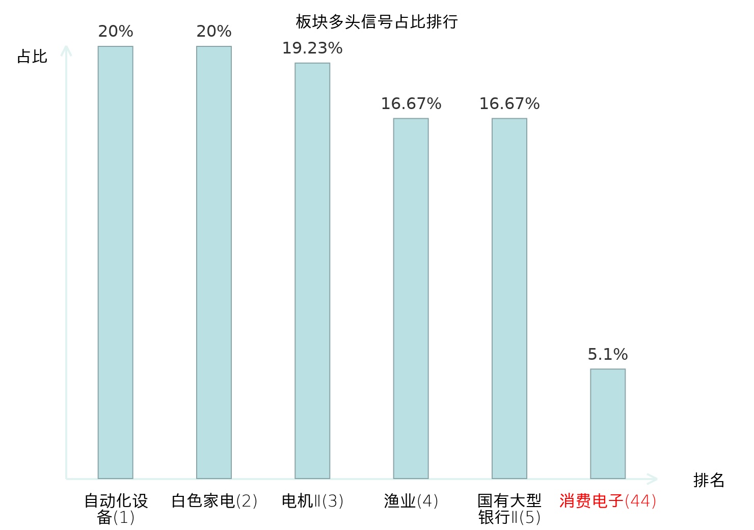 全市场所有行业板块中主力多头信号占比排名中,自动化设备板块位居第一。渔业板块名次提升最快,较昨日上升118位。