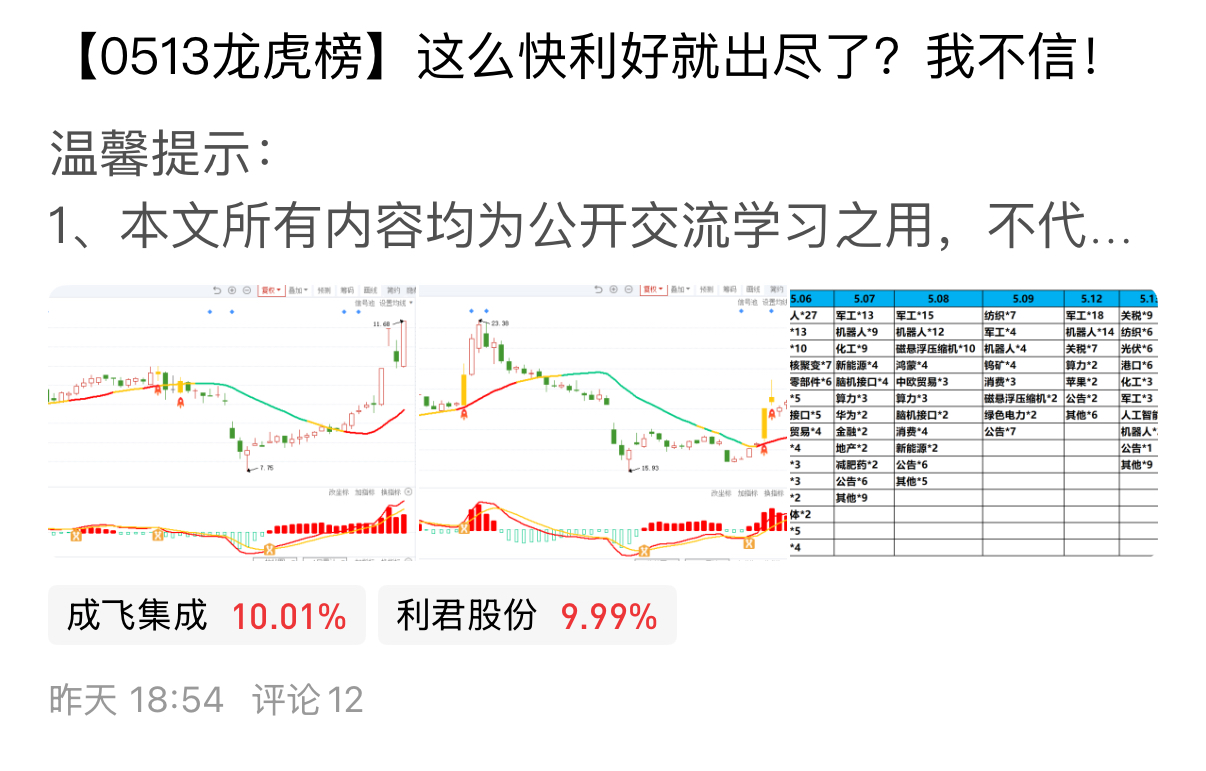 军工现在板块的问题还是涨停断层有点厉害,明天成飞集成和利君股份都要考验七板了。最近还没有妖股能过7板,他们的预期依然一般。扛过明天的分歧才能弱转强。