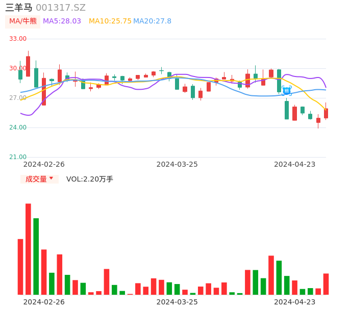 04月23日,三羊马收报25.91,股价涨幅3.85%,成交金额5676.31万元,换手率7.51%。