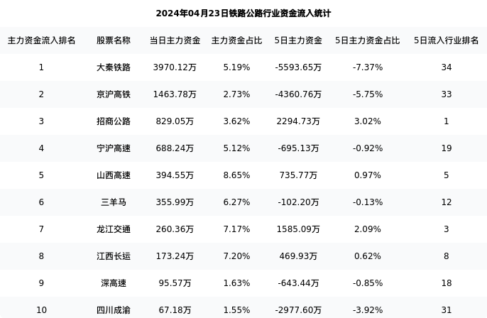 从主力资金流向来看,铁路公路行业今日主力资金流入11.35亿元,在所有申万二级行业中排名:98/131。