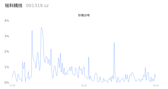 然后我们来看下当日成交的价格分布。将今天股票的最低价与最高价之差形成的价格区间进行切片,并画直方图进行分析,观察成交量在价格区间的分布情况。可以发现,当日的成交分布呈现左偏峰分布,这说明,该股票大部分成交集中在中位数以下,说明交易重心下降,近期可能会存在短线下跌风险。