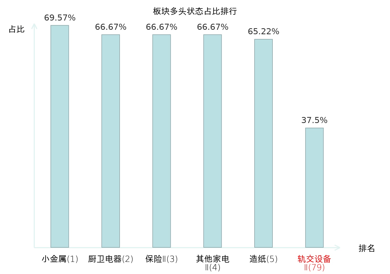 全市场所有行业板块中主力多头状态占比排名中,小金属板块位居第一。林业Ⅱ板块名次提升最快,较昨日上升86位。
