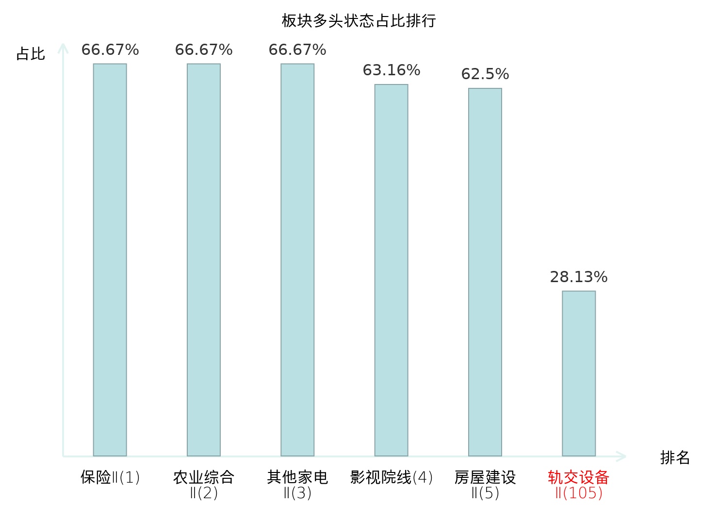 全市场所有行业板块中主力多头状态占比排名中,保险Ⅱ板块位居第一。渔业板块名次提升最快,较昨日上升103位。