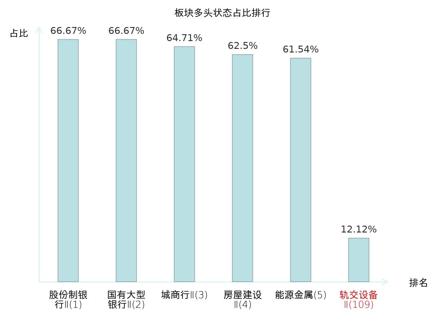 全市场所有行业板块中主力多头状态占比排名中,股份制银行Ⅱ板块位居第一。其他家电Ⅱ板块名次提升最快,较昨日上升102位。