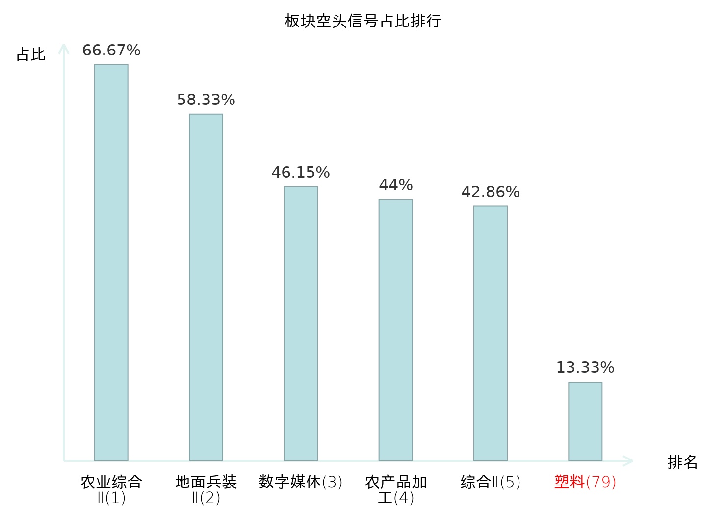 全市场所有行业板块中主力空头信号占比排名中,农业综合Ⅱ板块位居第一。医药商业板块名次提升最快,较昨日上升121位。
