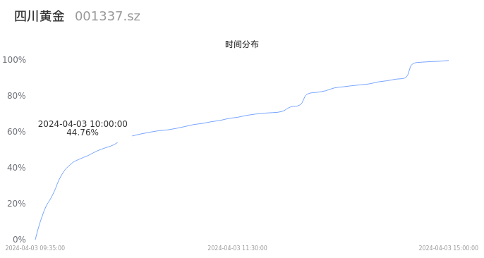 001337四川黄金2024年04月03日成交29.53万手,成交金额8.61亿元,相较昨日放量20.45万手,换手率10.24%,成交活跃。