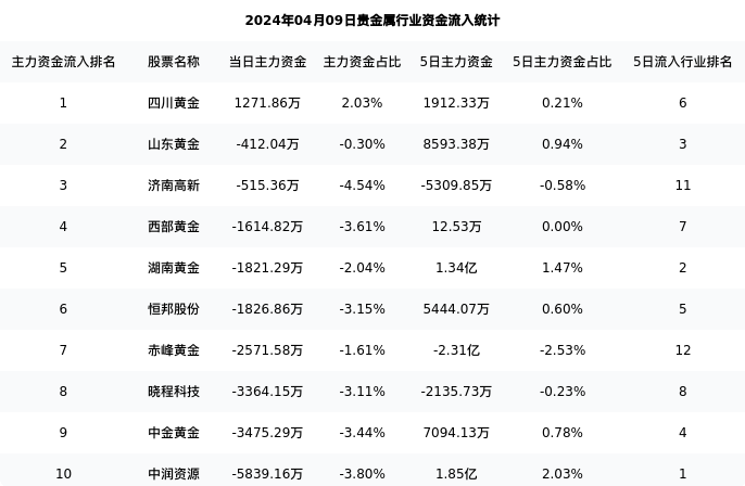 四川黄金今日净流入1271.86万元,主力占比2.03%,在行业内排名:1/12;5日净流入1912.33万元,主力占比0.21%,在行业内排名:6/12。