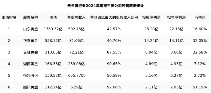 四川黄金最新报告期数据为年报,下表汇总了贵金属行业内市值靠前的公司年报主要经营数据
