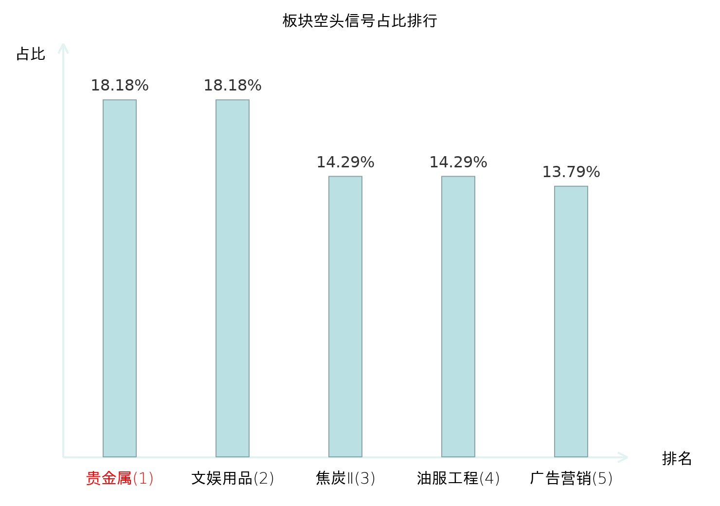 全市场所有行业板块中主力空头信号占比排名中,贵金属板块位居第一。家电零部件Ⅱ板块名次提升最快,较昨日上升106位。