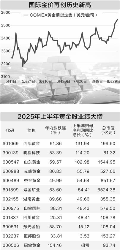 9月1日,国际金价震荡走高,COMEX黄金期货盘中最高上涨超1%,最高报价3557.1美元/盎司,再创历史新高。截至9月1日15时,COMEX黄金期货今年以来累计上涨近35%。