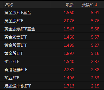 上证报中国证券网讯截至9月9日午间11点30分,COMEX黄金价格盘中再创新高,触及3694.9美元/盎司。受金价影响,国内黄金ETF在各类ETF产品领涨。其中,工银瑞信中证沪深港黄金产业股票ETF、华夏中证沪深港黄金产业股票ETF、永赢中证沪深港黄金产业股票ETF等涨逾5%。同时,四川黄金、西部黄金等黄金股早盘涨停。