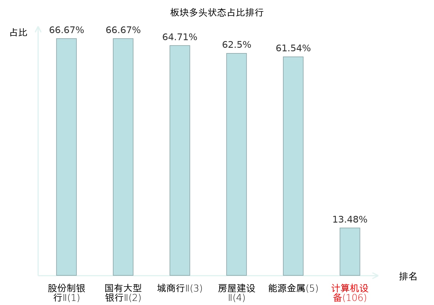 全市场所有行业板块中主力多头状态占比排名中,股份制银行Ⅱ板块位居第一。其他家电Ⅱ板块名次提升最快,较昨日上升102位。