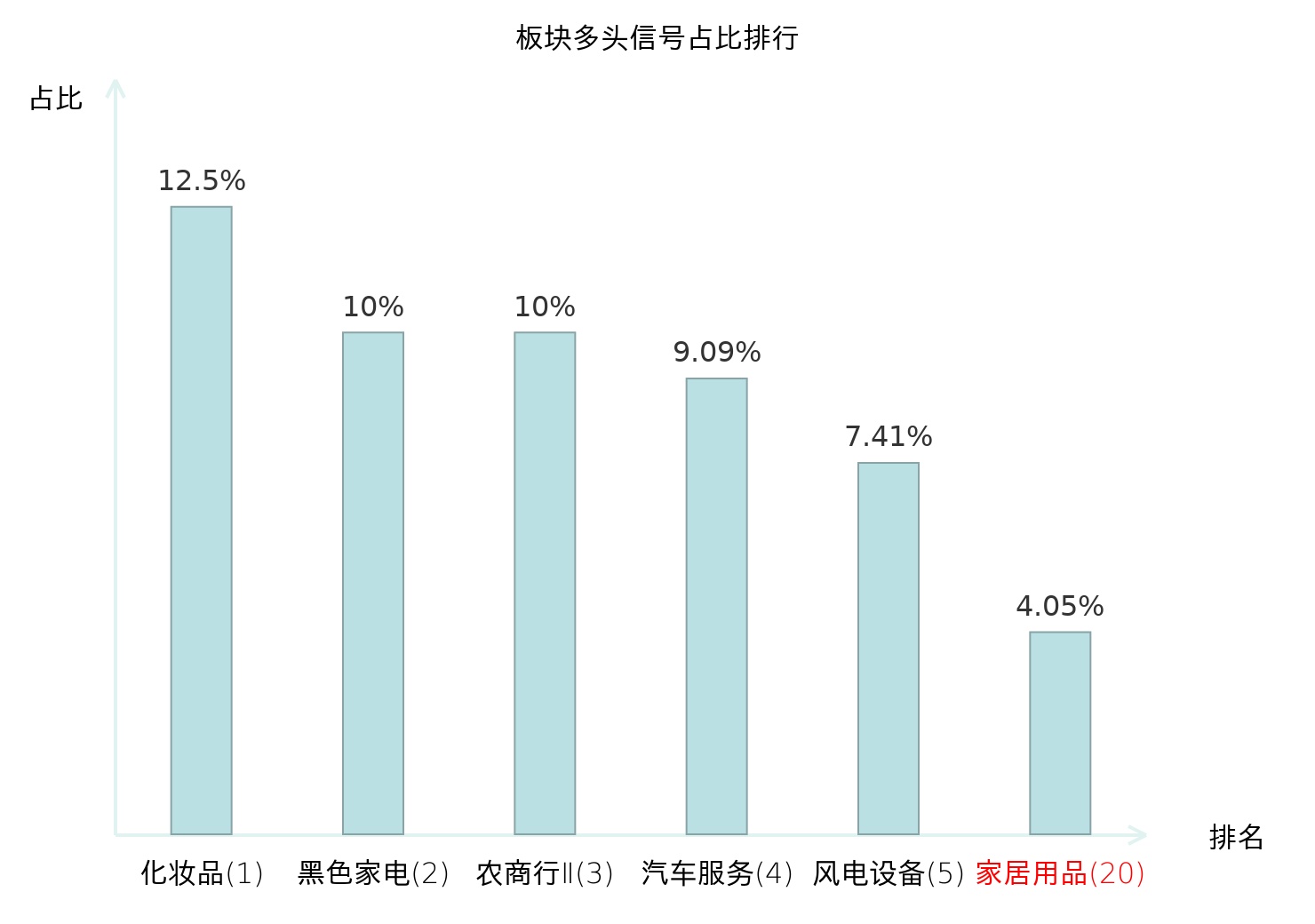 全市场所有行业板块中主力多头信号占比排名中,化妆品板块位居第一。黑色家电板块名次提升最快,较昨日上升111位。