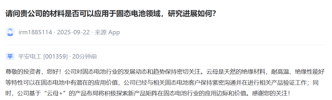 上证报中国证券网讯 平安电工21日在互动平台上回答投资者提问时表示,公司对固态电池行业的发展动态和趋势保持密切关注。云母是天然的绝缘材料,耐高温、绝缘性能好等特性可以在固态电池中有潜在的应用价值,公司已经与相关固态电池客户保持紧密沟通并在进行相关产品验证工作;同时,公司基于“云母+”的产品布局将积极探索新产品矩阵在固态电池行业的应用边际和价值。