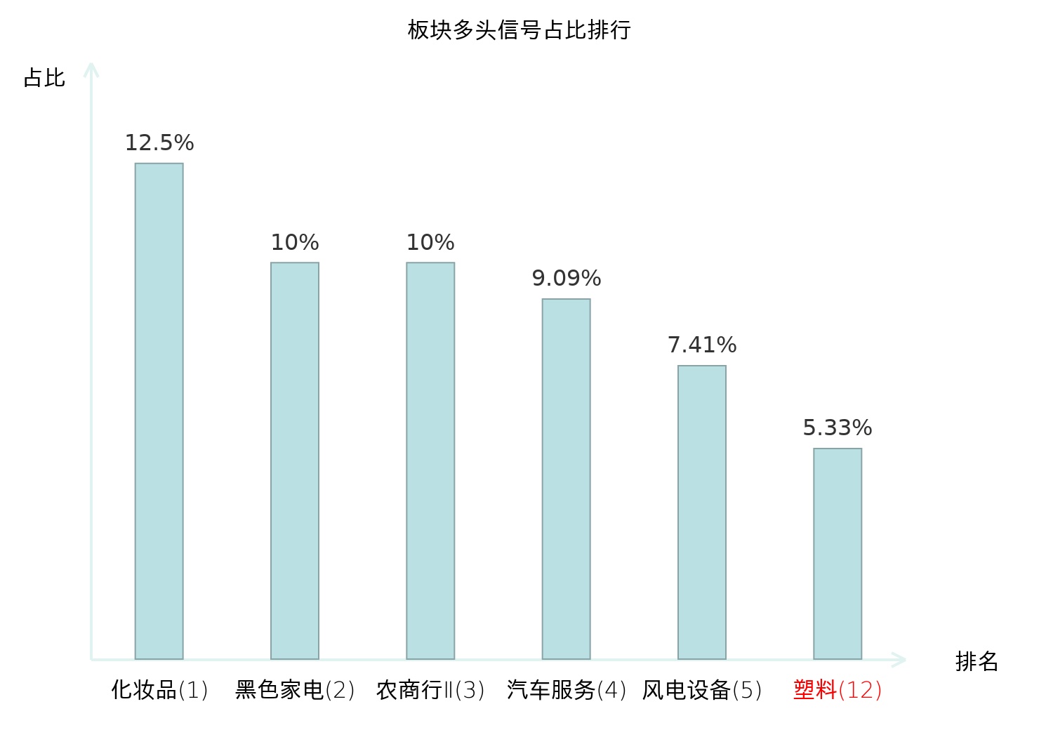 全市场所有行业板块中主力多头信号占比排名中,化妆品板块位居第一。黑色家电板块名次提升最快,较昨日上升111位。