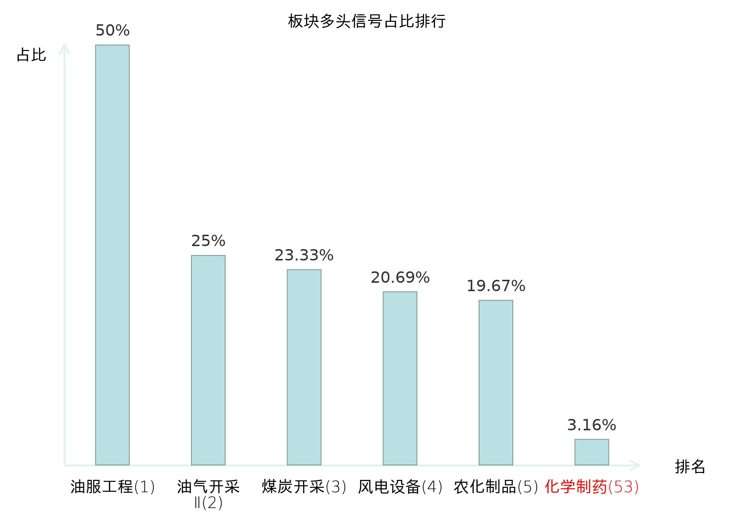 全市场所有行业板块中主力多头信号占比排名中,油服工程板块位居第一。油气开采Ⅱ板块名次提升最快,较昨日上升125位。