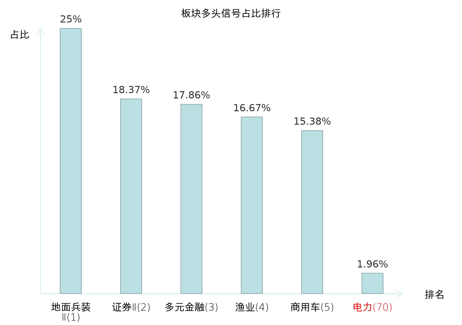全市场所有行业板块中主力多头信号占比排名中,地面兵装Ⅱ板块位居第一。渔业板块名次提升最快,较昨日上升119位。