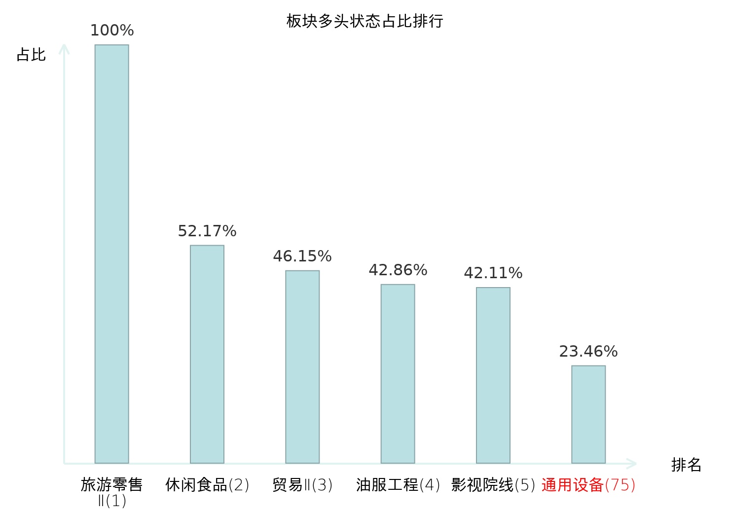 全市场所有行业板块中主力多头状态占比排名中,旅游零售Ⅱ板块位居第一。体育Ⅱ板块名次提升最快,较昨日上升99位。