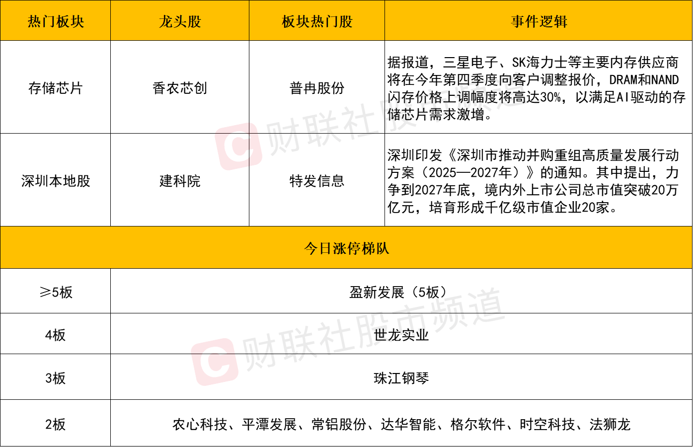 板块上,存储芯片板块涨幅居前,普冉股份、香农芯创、德明利、盈新发展、大为股份等个股涨停。