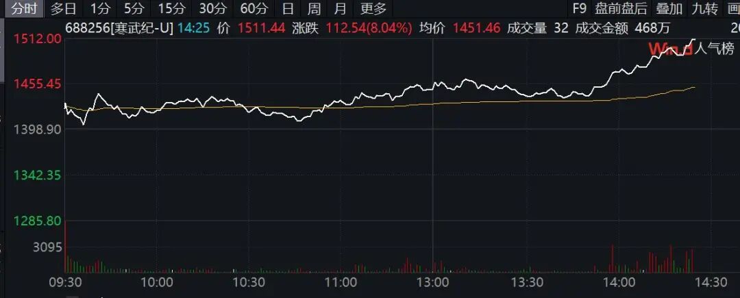 午后芯片股持续走高,算力芯片龙头寒武纪涨超7%,重返1500元上方,股价再度超过贵州茅台;神工股份、华虹公司、拓荆科技均涨超10%。