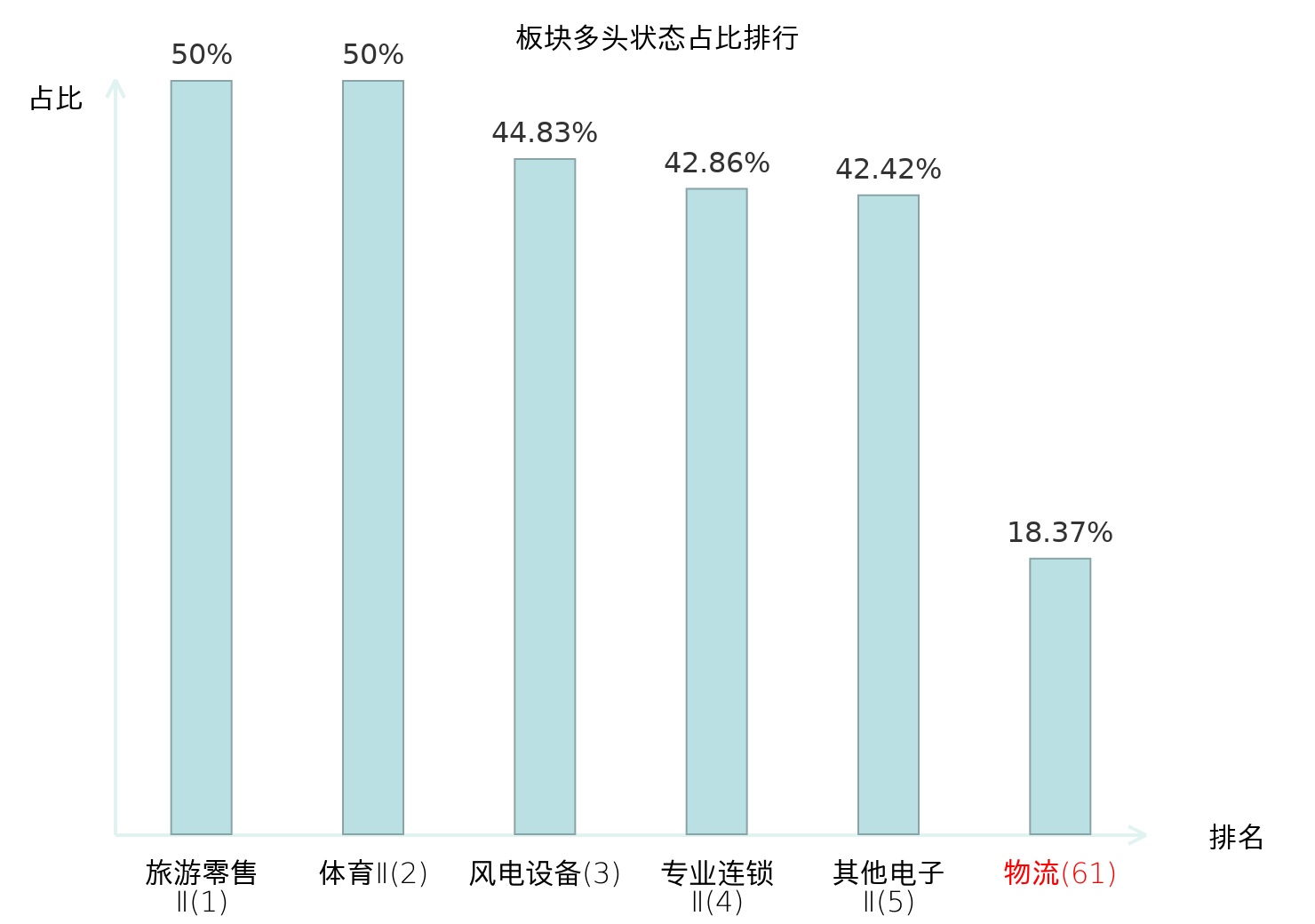 全市场所有行业板块中主力多头状态占比排名中,旅游零售Ⅱ板块位居第一。化妆品板块名次提升最快,较昨日上升66位。