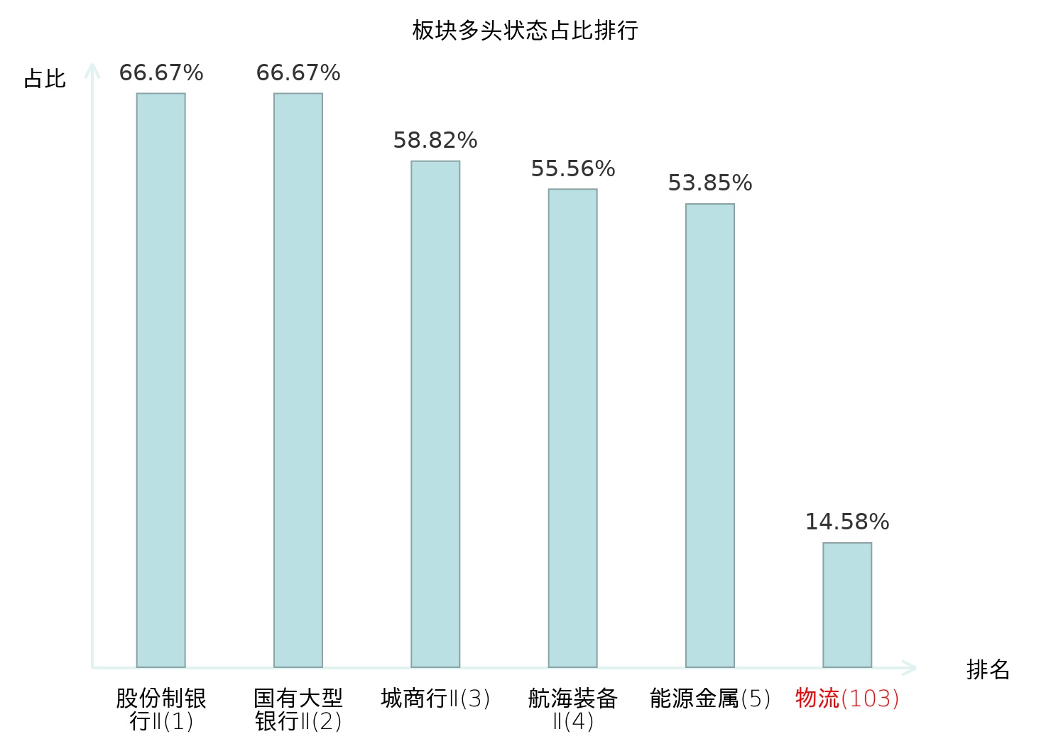全市场所有行业板块中主力多头状态占比排名中,股份制银行Ⅱ板块位居第一。渔业板块名次提升最快,较昨日上升61位。