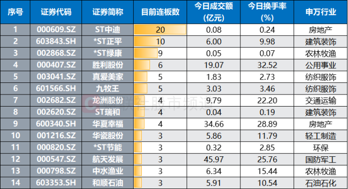 目前,ST中迪以20连板的高度继续成为时下市场“连板王”,*ST正平、*ST绿康则以10连板、9连板的规模紧随其后。若不计算ST股,胜利股份、真爱美家、九牧王目前连板数相对较高,分别达6连板、5连板、5连板。从行业层面(申万一级)来看,目前3连板及以上的连板股中,房地产、纺织服饰、建筑装饰、农林牧渔股数量相对较多。