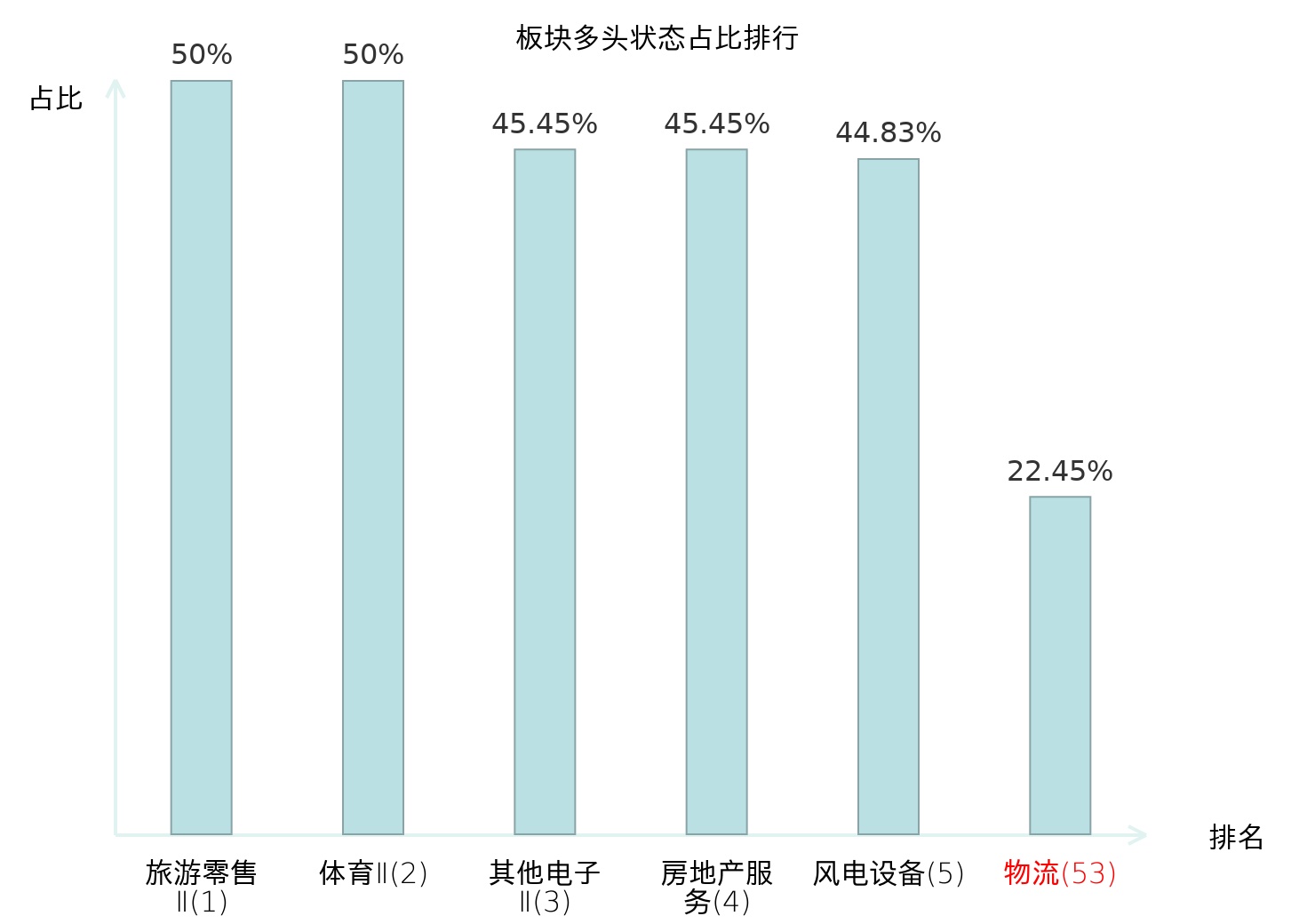 全市场所有行业板块中主力多头状态占比排名中,旅游零售Ⅱ板块位居第一。其他家电Ⅱ板块名次提升最快,较昨日上升112位。