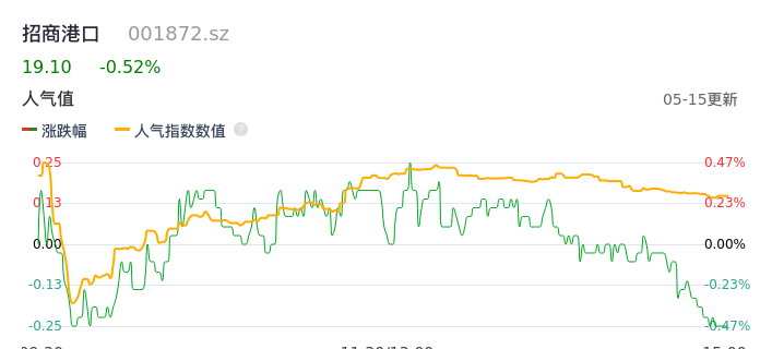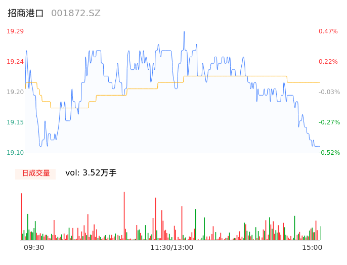 05月15日,招商港口收报19.10,股价涨幅-0.52%,成交金额6767.51万元,换手率0.20%。