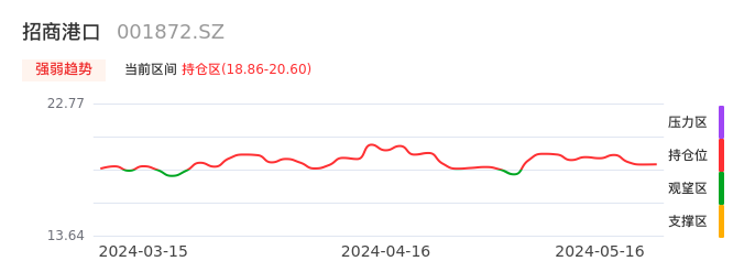 我们来看一下该股的九方特色指标强弱趋势的情况:招商港口自04月30日从观望区上穿到持仓区。股价近期在多头区域持续强势上扬,上升动能仍较为充足,可积极关注。后续重点关注上方压力位:20.60元是否能突破上攻。